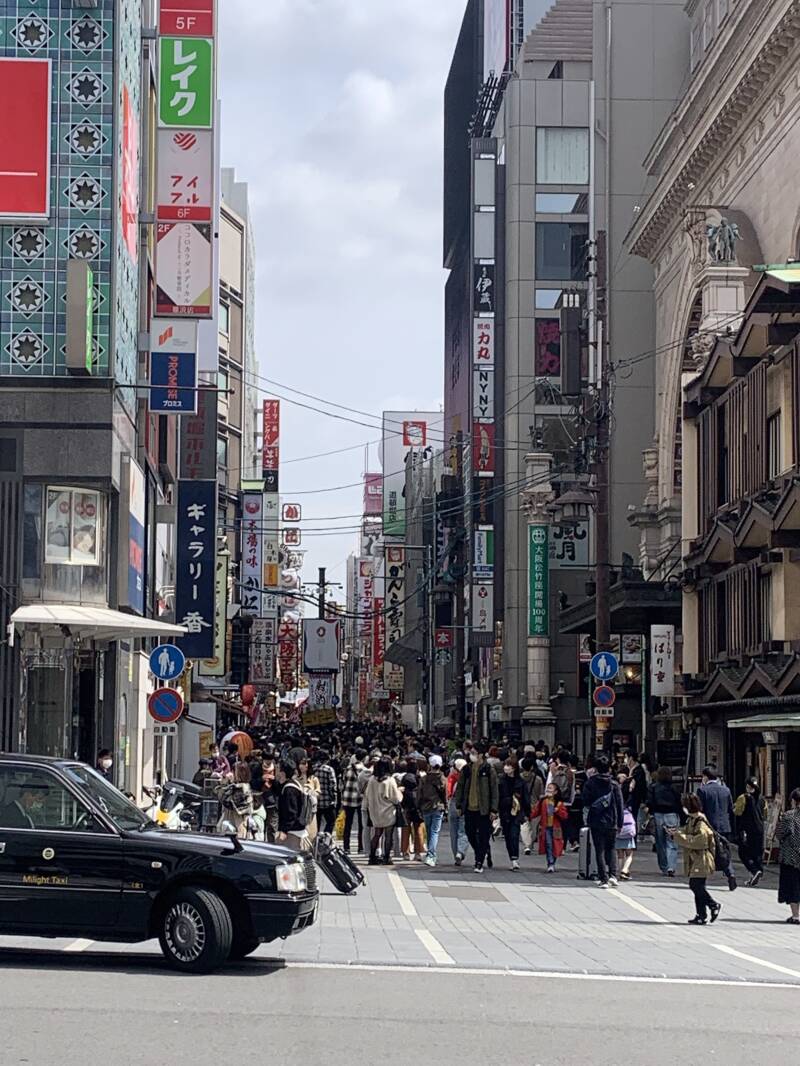 We leave Tokyo on the bullet train to Osaka. The party we are travelling with has a fixer who helps a group of us navigate the station, without whom I’m not sure we’d have found the right platform. Emma and me stop at an Eki Ben to grab a bento box meal for the journey. The boxes are cute, beautifully designed and wrapped and full of sushi, yakitori, steamed rice, omelette, karage etc etc.